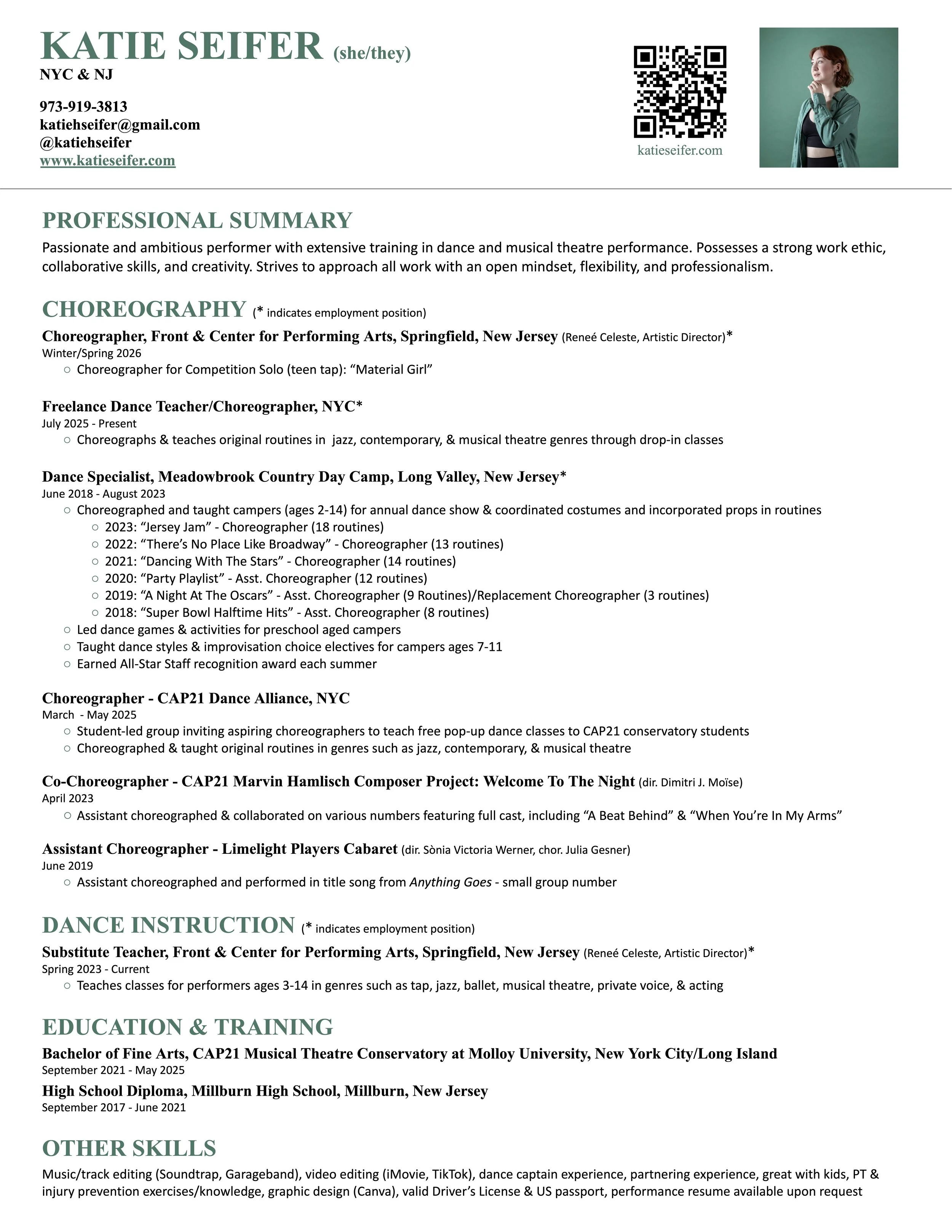 Since my camp counselor days, I have been experimenting with choreography more suited for young adults and learning what kinds of dances I create speak to me and feel good in my body. My favorite style to choreograph is contemporary jazz with a commercial flair. It brings me nostalgia from dancing competitively growing up, and I combine it with my love of musical theatre. In the last year, I’ve been teaching drop-in classes for my friends and former classmates, and I’ve had a blast seeing another passion of mine come to life!