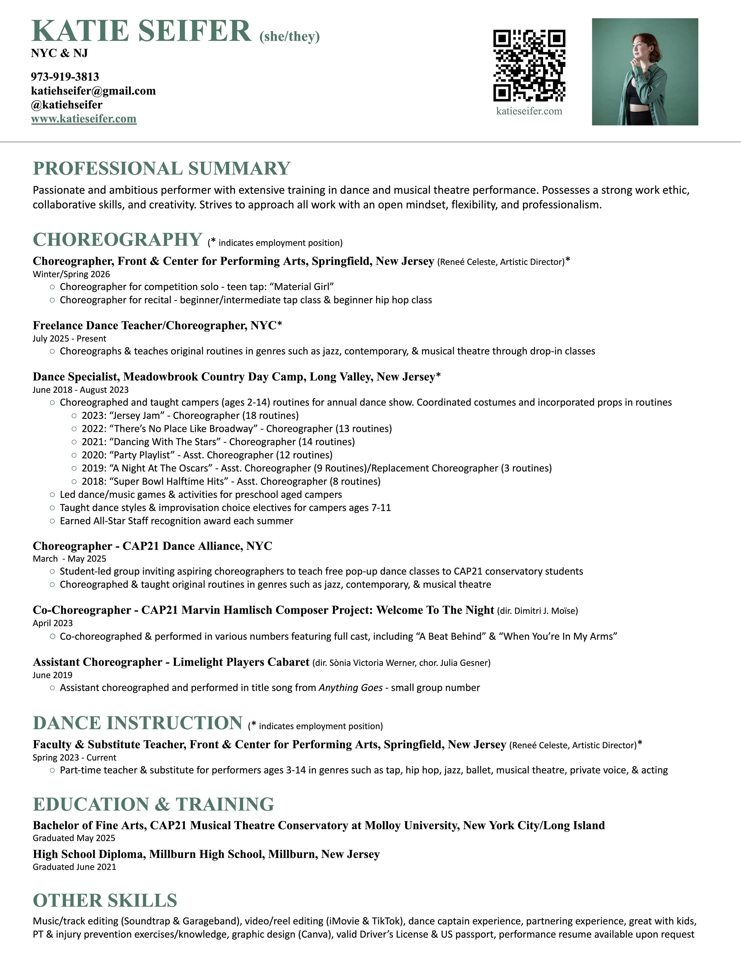 Since my camp counselor days, I have been experimenting with choreography more suited for young adults and learning what kinds of dances I create speak to me and feel good in my body. My favorite style to choreograph is contemporary jazz with a commercial flair because it brings me nostalgia from dancing competitively growing up, and I combine it with my love of musical theatre. In the last year, I’ve been teaching drop-in classes for my friends and former classmates, and I am now part of the dance faculty at my home studio, Front & Center, where I’ve had a blast seeing another passion of mine come to life!